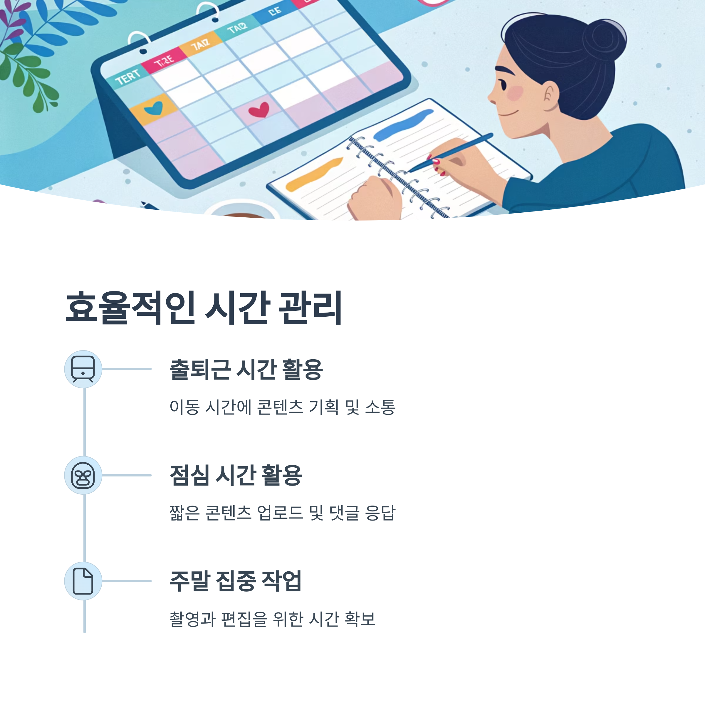 A3. 출퇴근 시간, 주말 등을 활용하여 콘텐츠 제작과 관리를 진행하고, 꾸준한 활동을 유지하는 것이 중요합니다.