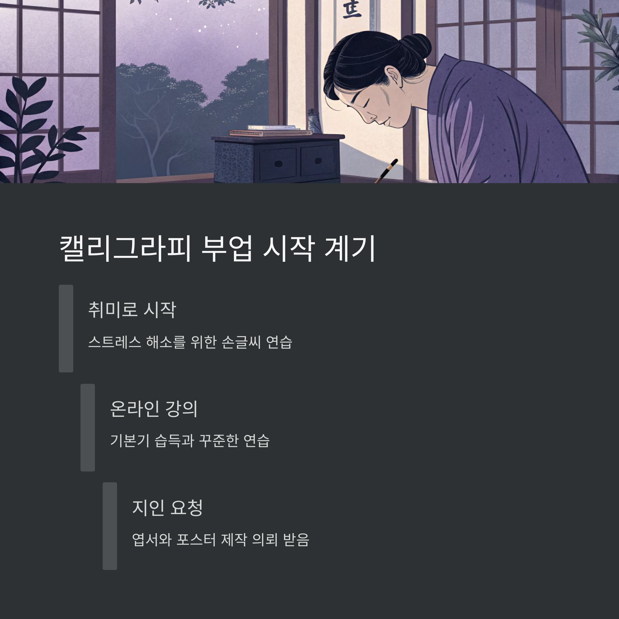 처음에는 단순한 취미로 시작했습니다. 손글씨에 관심이 있었고, 스트레스를 해소하기 위해 캘리그라피를 배우기 시작했죠. 온라인 강의를 통해 기본기를 익히고, 연습을 거듭하면서 자신감이 생겼습니다. 그러던 중, 지인들의 요청으로 엽서나 포스터를 만들어주면서 부업으로 전환하게 되었습니다.