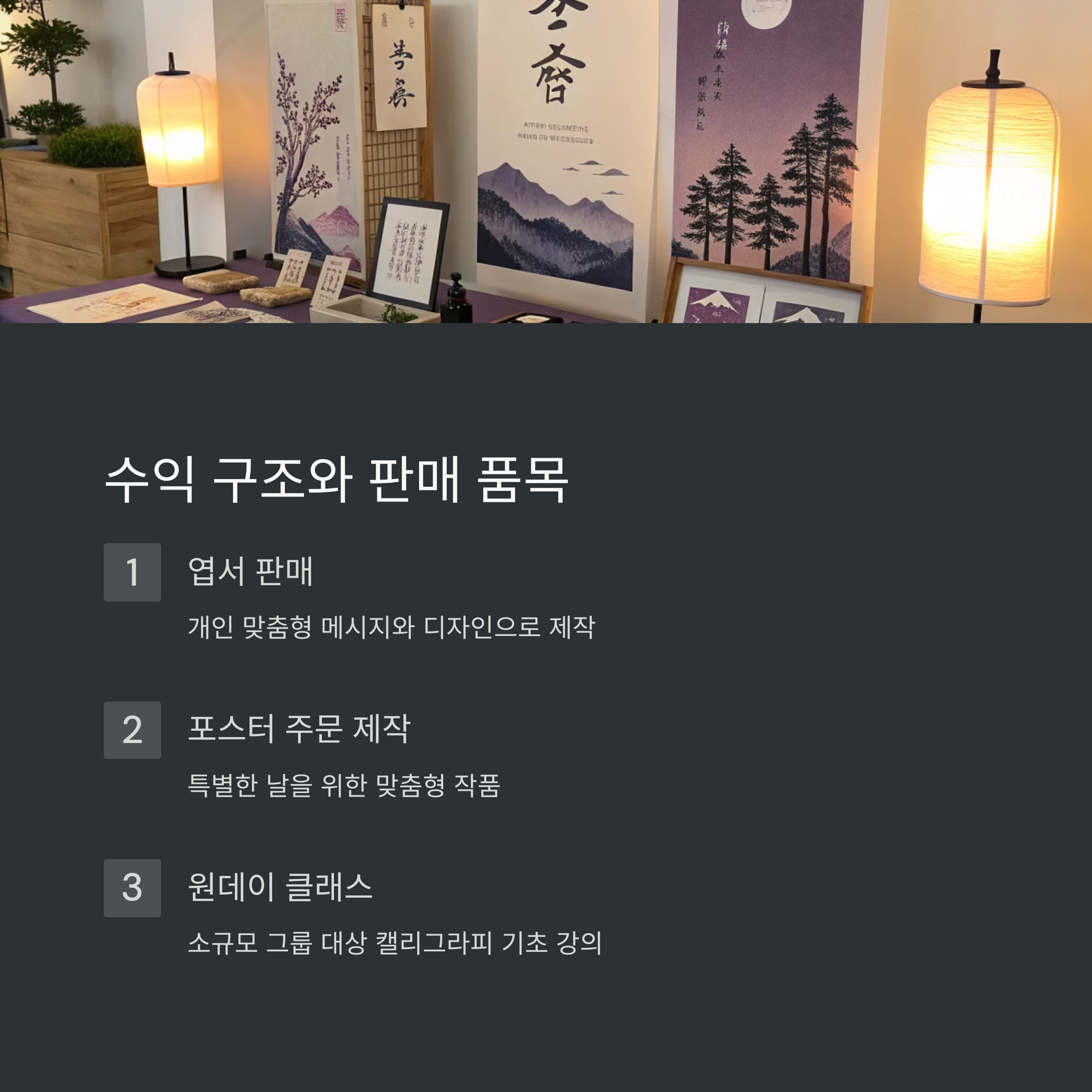| 엽서 판매 | 300,000원 | 개당 3,000원, 월 100장 판매 |