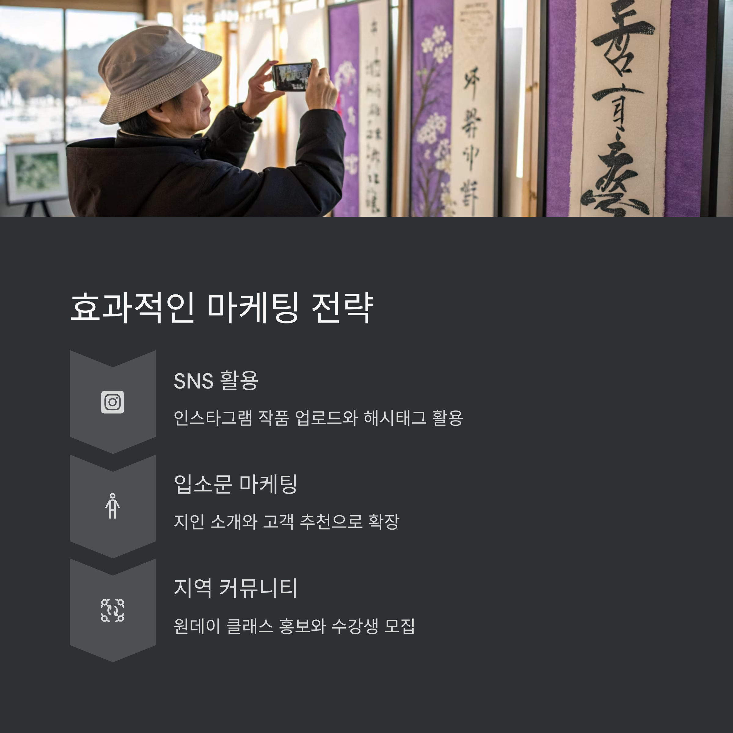 인스타그램을 활용한 마케팅이 효과적이었습니다. 작품을 꾸준히 업로드하고, 해시태그를 활용하여 노출을 높였습니다. 또한, 지인들의 소개와 입소문을 통해 고객을 확보할 수 있었습니다. 원데이 클래스는 지역 커뮤니티에 홍보하여 수강생을 모집했습니다.