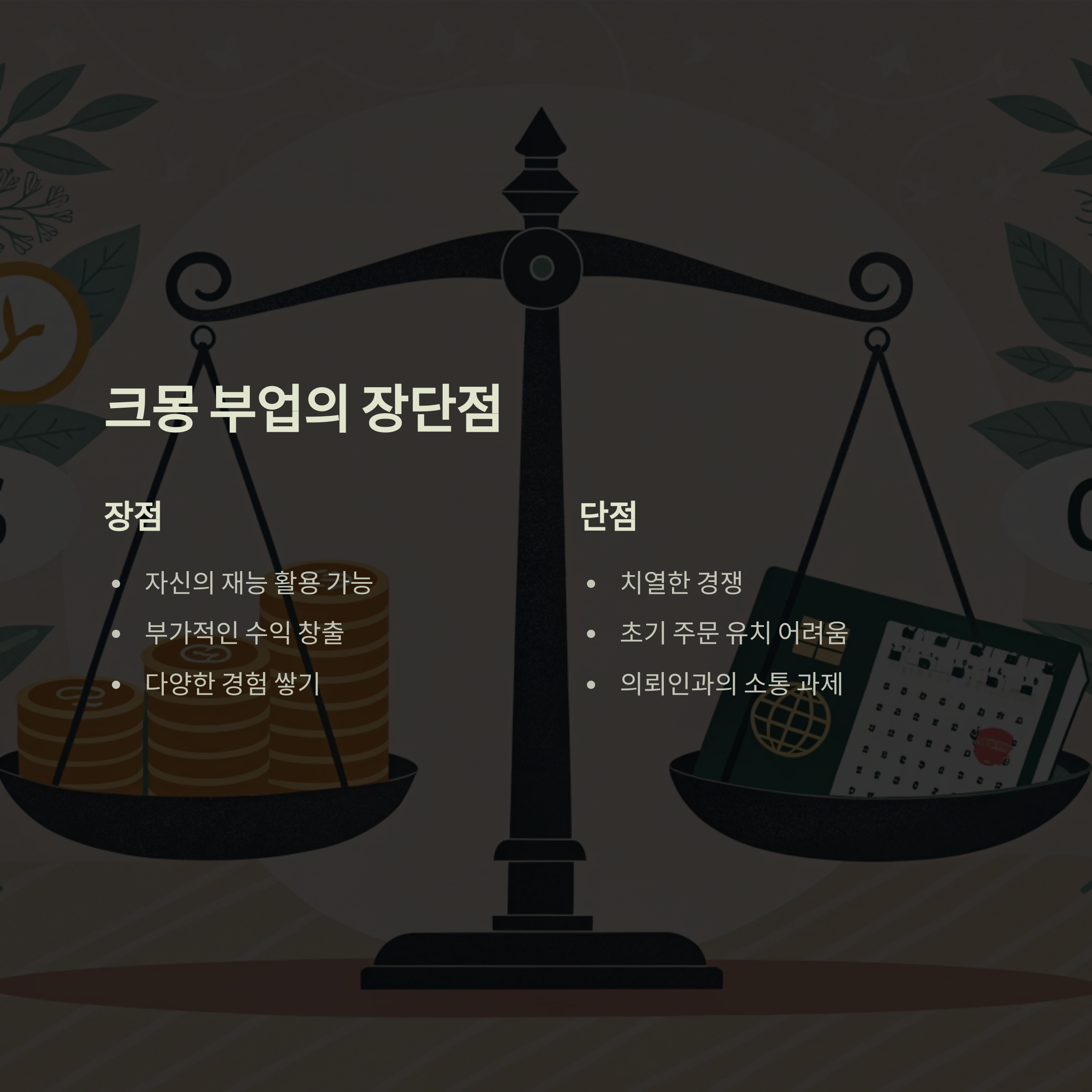 크몽을 통한 부업은 자신의 재능을 활용할 수 있다는 점에서 큰 장점이 있습니다. 하지만, 경쟁이 치열하고, 초기에는 주문을 받기까지 시간이 걸릴 수 있습니다. 또한, 의뢰인과의 소통이나 작업 조건에 대한 협의 등에서 어려움을 겪을 수도 있습니다.