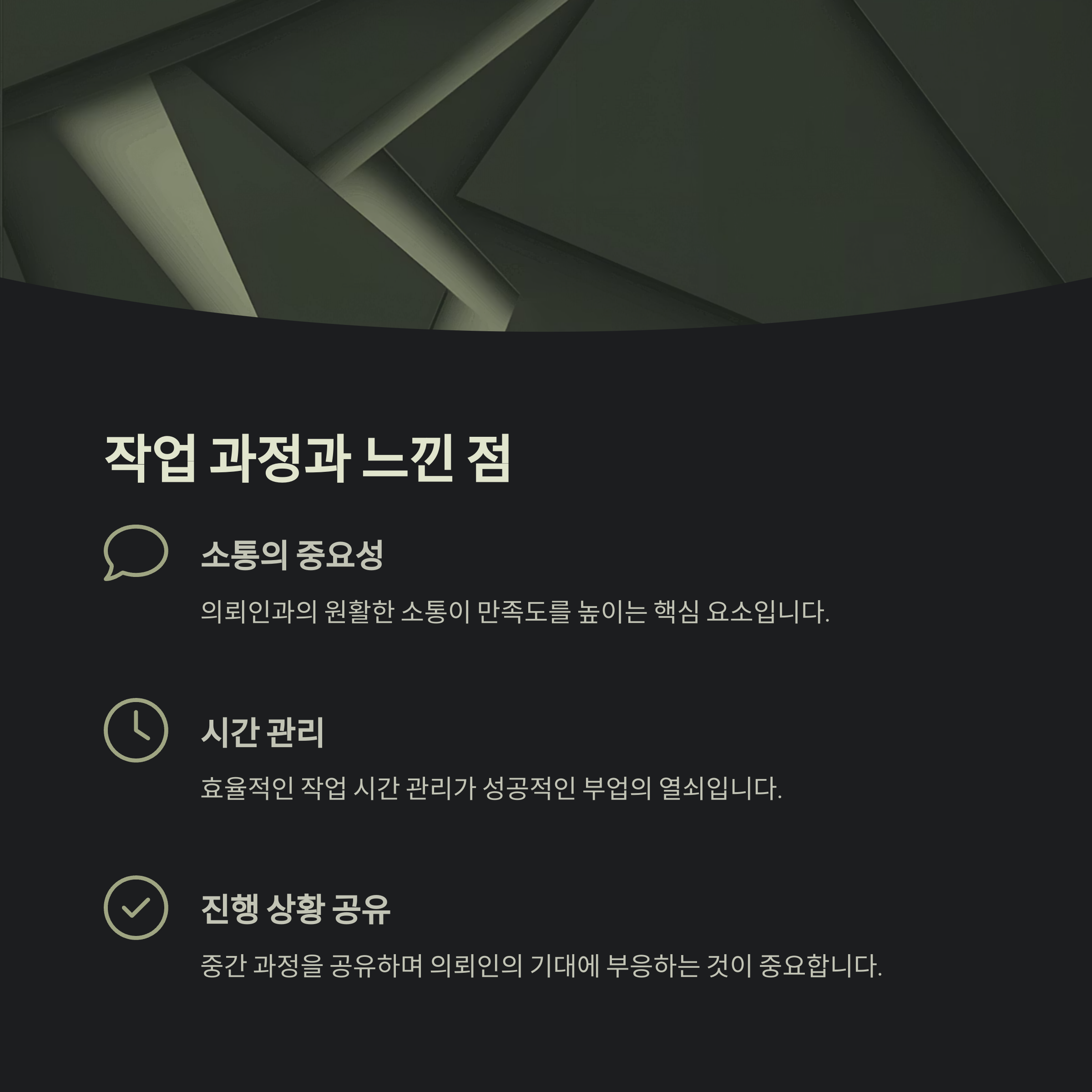 작업을 진행하면서 의뢰인과의 소통이 중요하다는 것을 깨달았습니다. 의뢰인의 요구사항을 정확히 파악하고, 중간중간 진행 상황을 공유하는 것이 만족도를 높이는 데 도움이 되었습니다. 또한, 작업 시간을 효율적으로 관리하는 것도 중요했습니다.