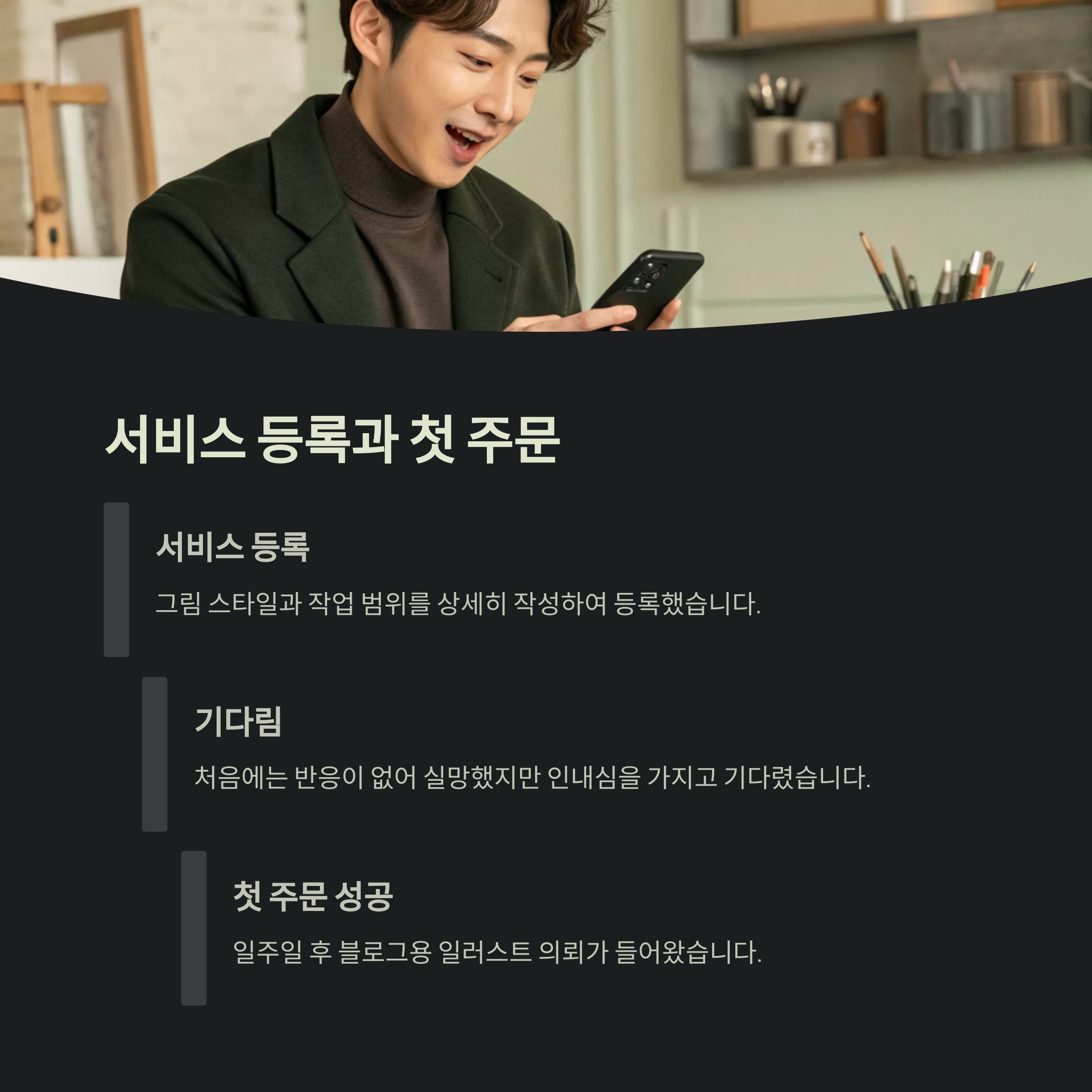 처음에는 단순히 취미로 그리던 그림을 활용해 부업을 해보고 싶었습니다. 크몽이라는 플랫폼을 알게 되었고, 다양한 분야의 프리랜서들이 활동하고 있다는 점에서 흥미를 느꼈습니다. 그래서 저도 제 그림을 서비스로 등록해보기로 했습니다.