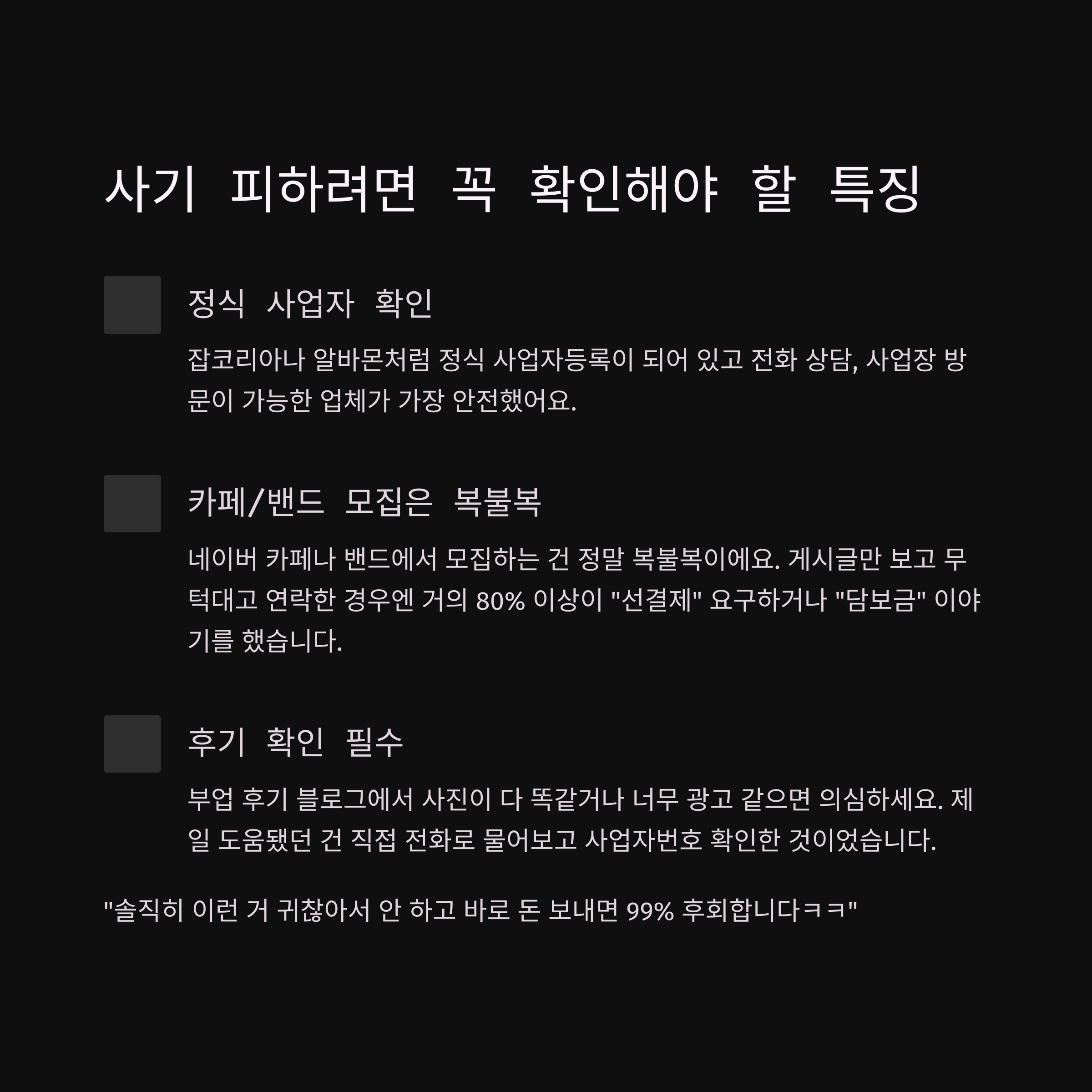 네이버 카페나 밴드에서 모집하는 건 솔직히 말하면 진짜 복불복이에요. 실제로 저도 카페에서 구한 첫 업체는 친절했지만 지인 추천이 많았던 경우였어요. 게시글만 보고 무턱대고 연락한 경우엔 거의 80% 이상이 "선결제" 요구하거나 "담보금" 이야기하더라고요.