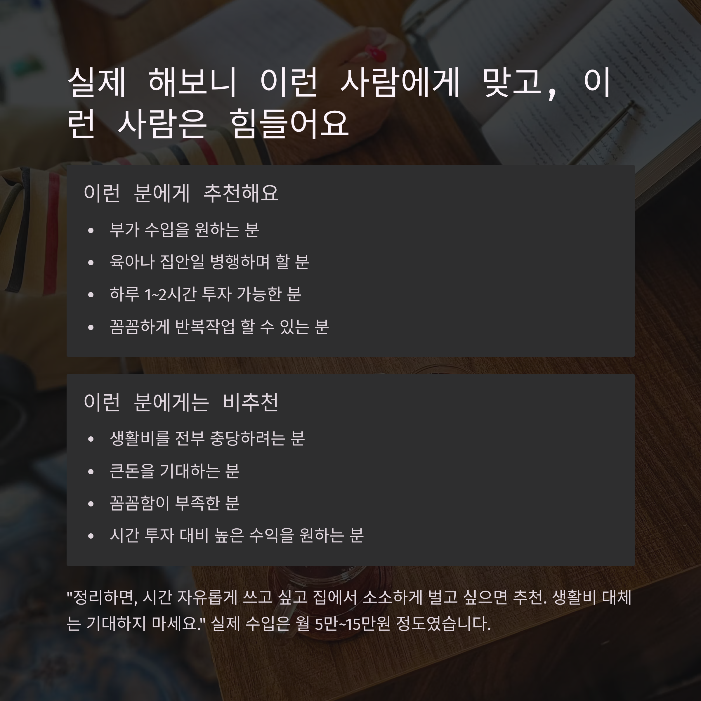 "정리하면, 시간 자유롭게 쓰고 싶고 집에서 소소하게 벌고 싶으면 추천. 생활비 대체는 기대하지 마세요."