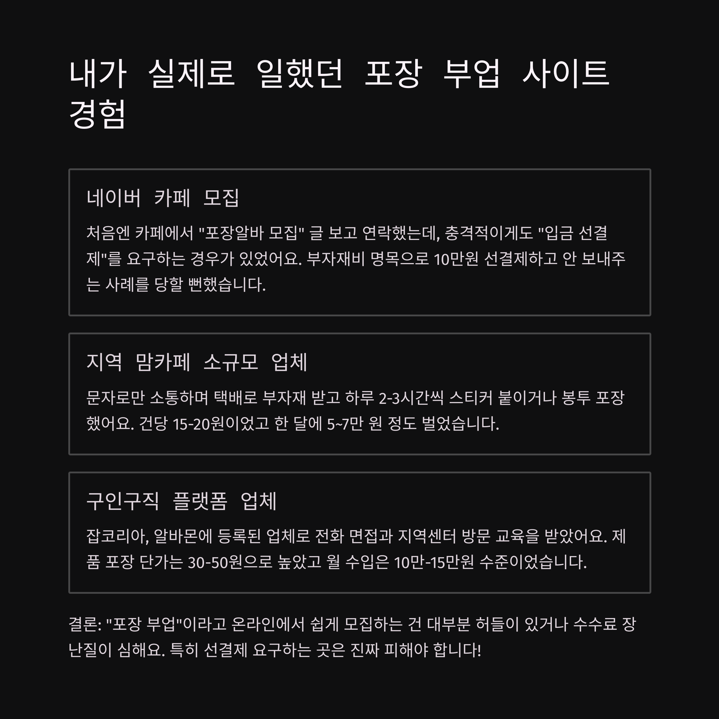 제가 느낀 건 "포장 부업"이라고 온라인에서 쉽게 모집하는 건 대부분 허들이 있거나 수수료 장난질이 심하다는 점이었어요. 특히 선결제 요구하는 곳은 진짜 걸러야 한다는 거 ㅋㅋ