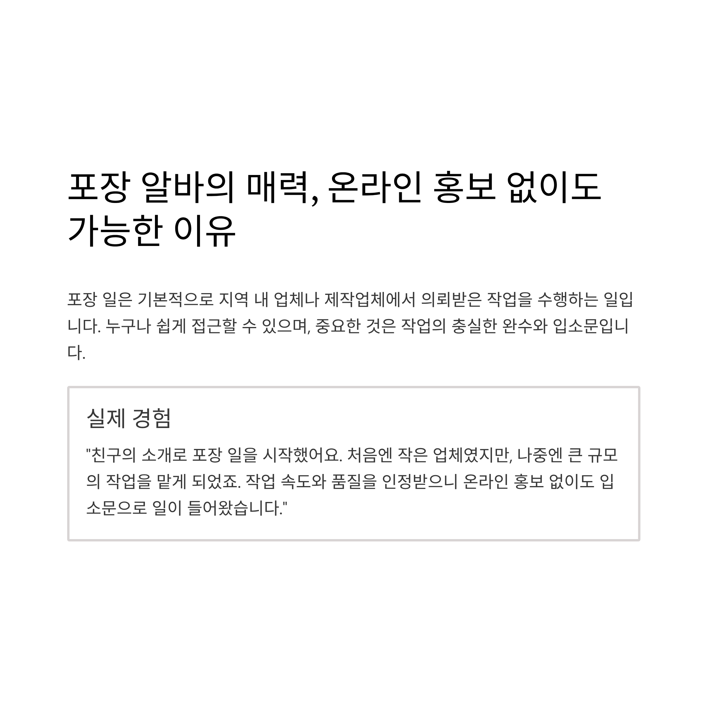“저는 처음에 친구의 소개로 포장 일을 시작했어요. 시작은 작은 업체였지만, 나중에는 큰 규모의 작업을 하게 되었죠. 포장 일은 정말 기본적인 작업이라, 처음엔 어렵지 않았어요. 일단 한 번 하게 되면, 제 작업 속도와 품질을 인정해주는 사람들이 생기기 시작했습니다. 온라인 홍보는 전혀 하지 않았지만, 사람들이 저를 알아보고 일을 요청하더라고요. 입소문이 정말 중요하다는 걸 깨달았어요.”