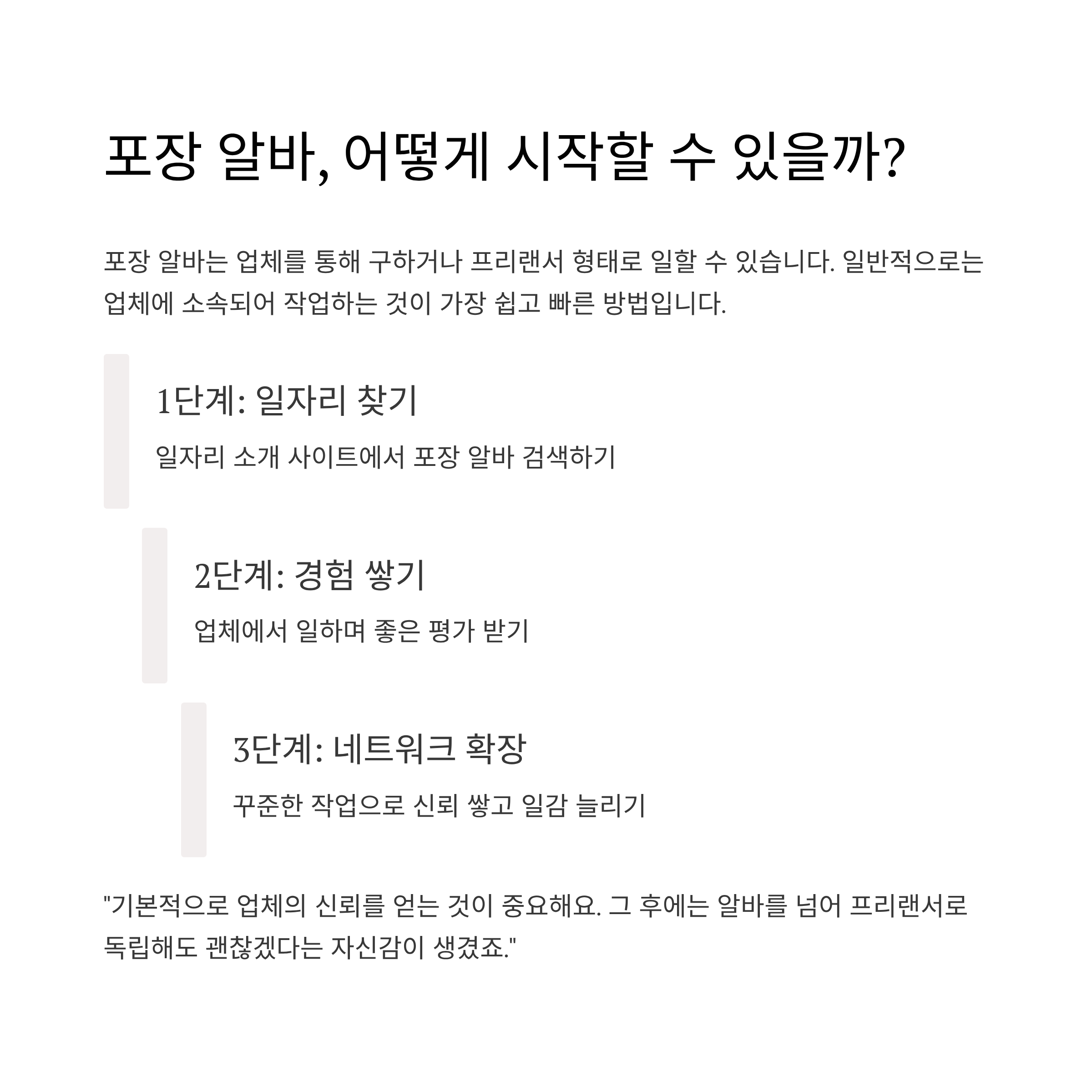 “처음 시작할 때는 일자리 소개 사이트에서 포장 알바를 구했어요. 그 후에는 업체에서 일한 경험을 통해 좋은 평가를 받았고, 꾸준히 일을 맡게 되었습니다. 기본적으로 업체의 신뢰를 얻는 것이 중요해요. 그 후에는 알바를 넘어 **프리랜서로 독립해도 괜찮겠다는 자신감이 생겼죠.”