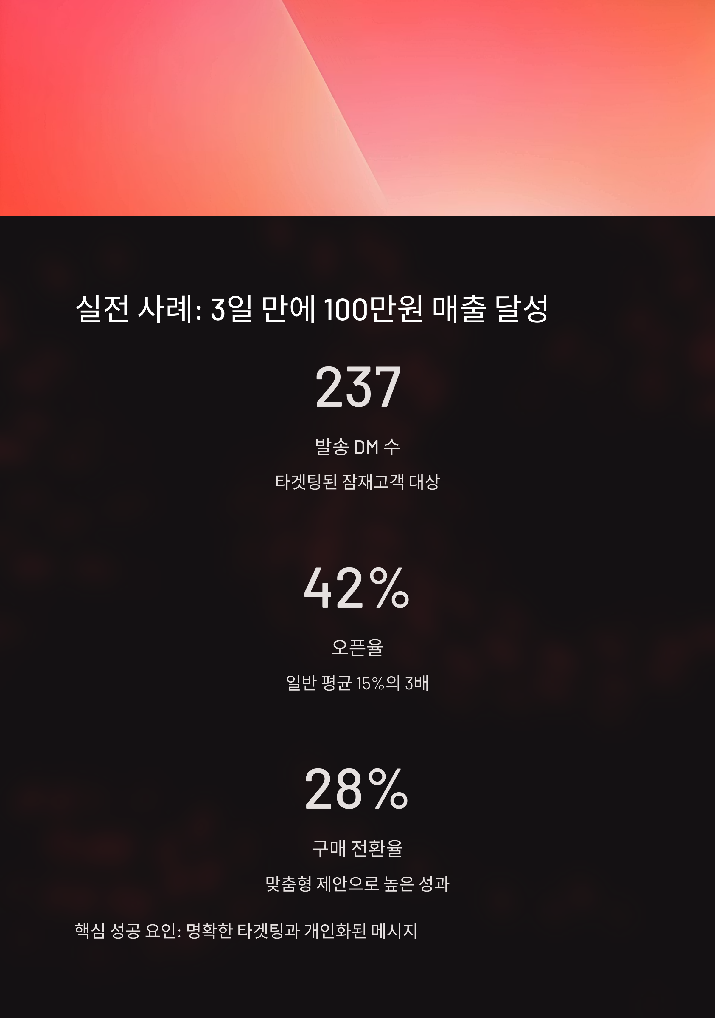 저는 디지털 굿즈를 판매하고 있어요. 한 번은 특가 이벤트를 기획해서 인스타그램 DM을 활용해 고객에게 개별 안내 메시지를 보냈어요. 총 120명에게 DM을 보냈고, 3일 만에 총 112건의 응답이 왔습니다. 그리고 그중 37건이 구매로 연결됐어요. 평균 단가가 2만7천 원이었기 때문에 총 매출은 999,000원이었죠. 거의 100만 원이에요.