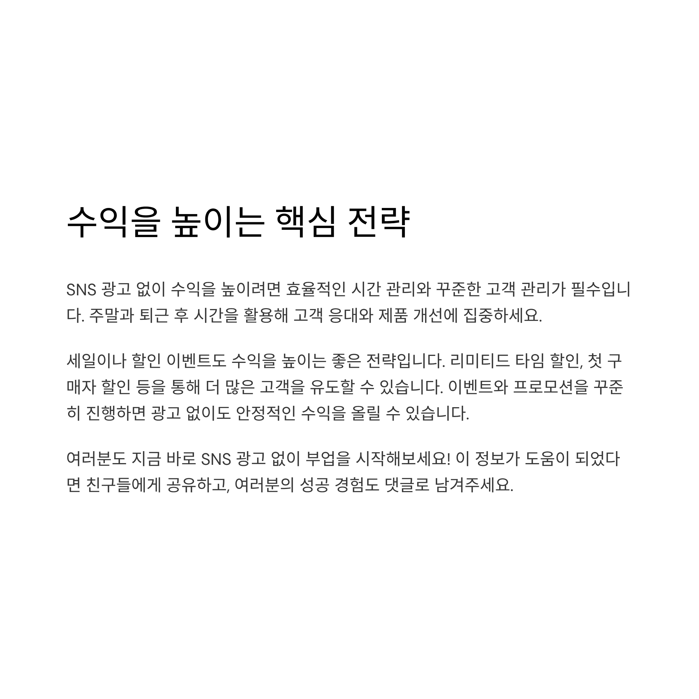 SNS 광고 없이도 수익을 올릴 수 있었던 이유는 입소문 마케팅이 효과적이었기 때문입니다. 처음에는 팔로워가 적었지만, 고객들이 제품을 사용하고 후기를 남기면서 자연스럽게 홍보가 이루어졌어요. 또한, 추천 이벤트나 후기 작성 이벤트를 통해 고객 참여를 유도했습니다.