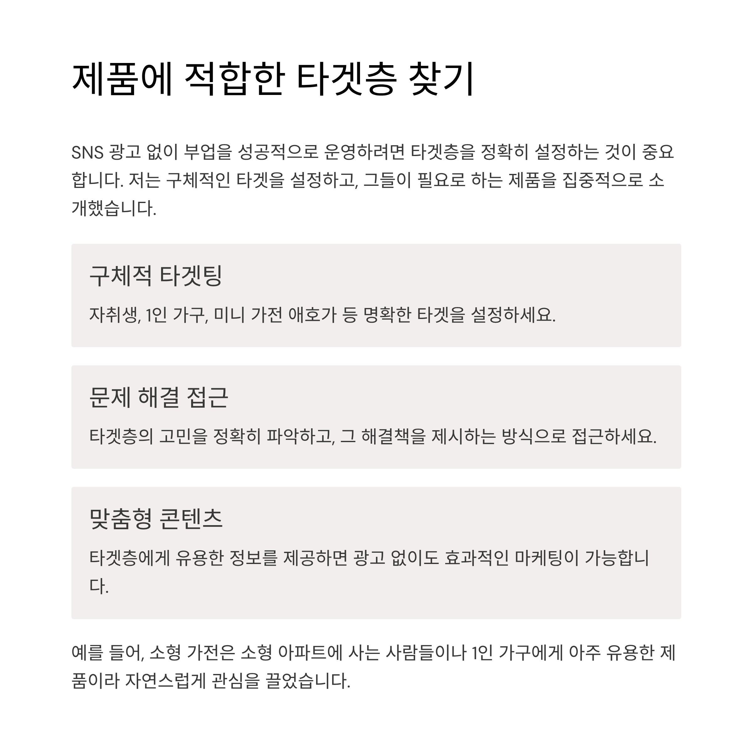 SNS 광고 없이 부업을 성공적으로 운영하려면 타겟층을 잘 설정하는 것이 중요합니다. 저는 자취생, 혼자 사는 사람들, 미니 가전 애호가 등 구체적인 타겟을 설정하고, 그들이 필요로 하는 제품을 집중적으로 소개했습니다. 예를 들어, 소형 가전이나 실용적인 가전 제품은 소형 아파트에 사는 사람들이나 1인 가구에게 아주 유용한 제품이라 팔로워들이 자연스럽게 관심을 가졌어요.