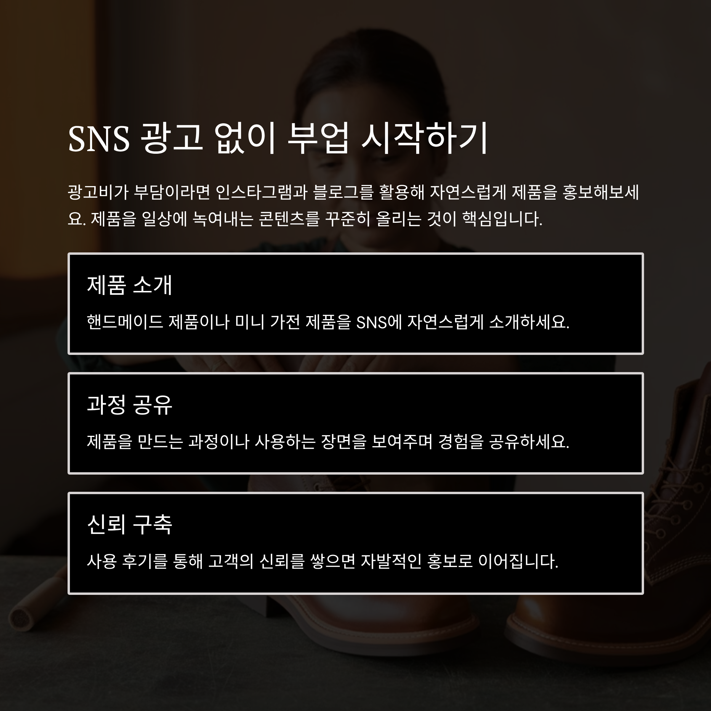 SNS 광고 없이도 사람들이 제 제품에 대해 궁금해하게 만들기 위해, 자연스럽게 제품을 일상에 녹여내는 콘텐츠를 꾸준히 올렸습니다. 예를 들어, 핸드메이드 액세서리를 만드는 과정을 보여주거나, 제품을 사용하는 장면을 소개하며 사람들이 직접 제품을 경험하는 듯한 느낌을 주었죠. 이렇게 하니 팔로워들이 자발적으로 제품을 소개하면서 홍보가 되었고, 수익을 자연스럽게 올리게 되었습니다.