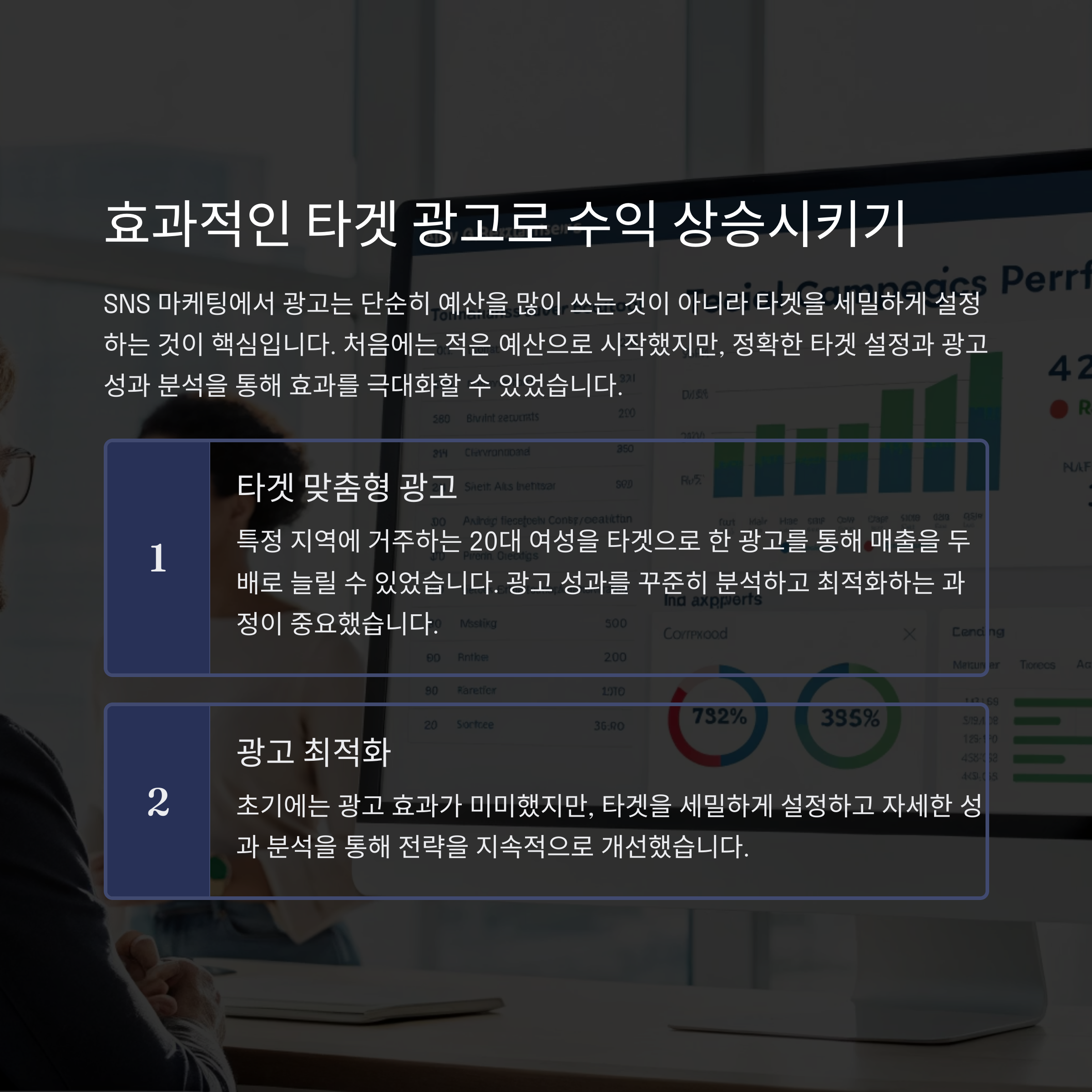 광고는 단순히 예산을 많이 쓴다고 효과가 있는 게 아닙니다. 타겟 맞춤형 광고를 진행하는 것이 가장 효과적이라는 것을 깨달았죠. 예를 들어, 특정 지역에 거주하는 20대 여성을 타겟으로 한 광고를 통해 매출을 두 배로 늘릴 수 있었습니다.