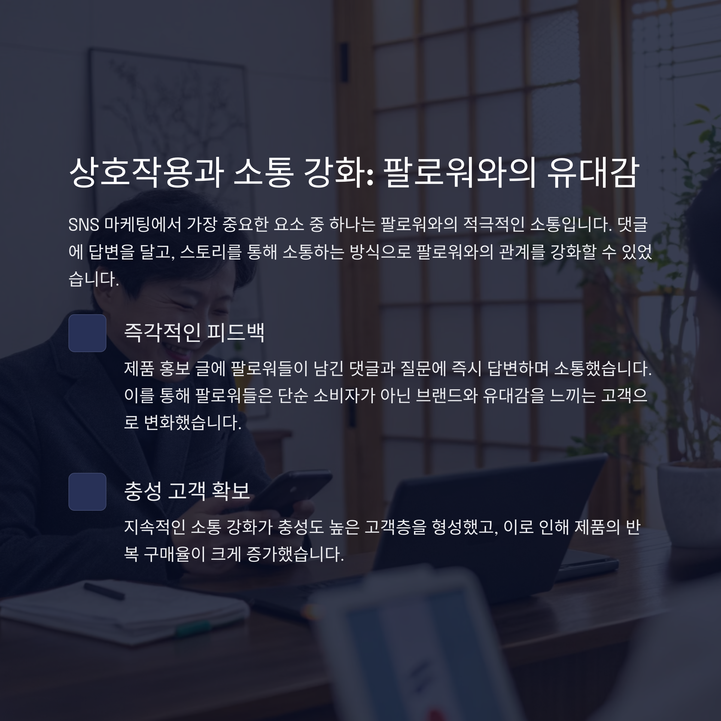 SNS 마케팅에서 가장 중요한 점 중 하나는 팔로워와의 소통입니다. 댓글에 답변을 달고, 스토리로 소통하는 방식으로 팔로워와의 관계를 강화할 수 있었습니다. 제가 제품 홍보 글을 올리면, 팔로워들이 댓글로 자신의 의견을 남기거나 질문을 던졌는데, 그때마다 저는 즉시 피드백을 주며 소통을 했습니다. 팔로워들은 단순히 상품을 구매하는 소비자가 아니라, 브랜드와 유대감을 느끼는 고객으로 변화했죠.