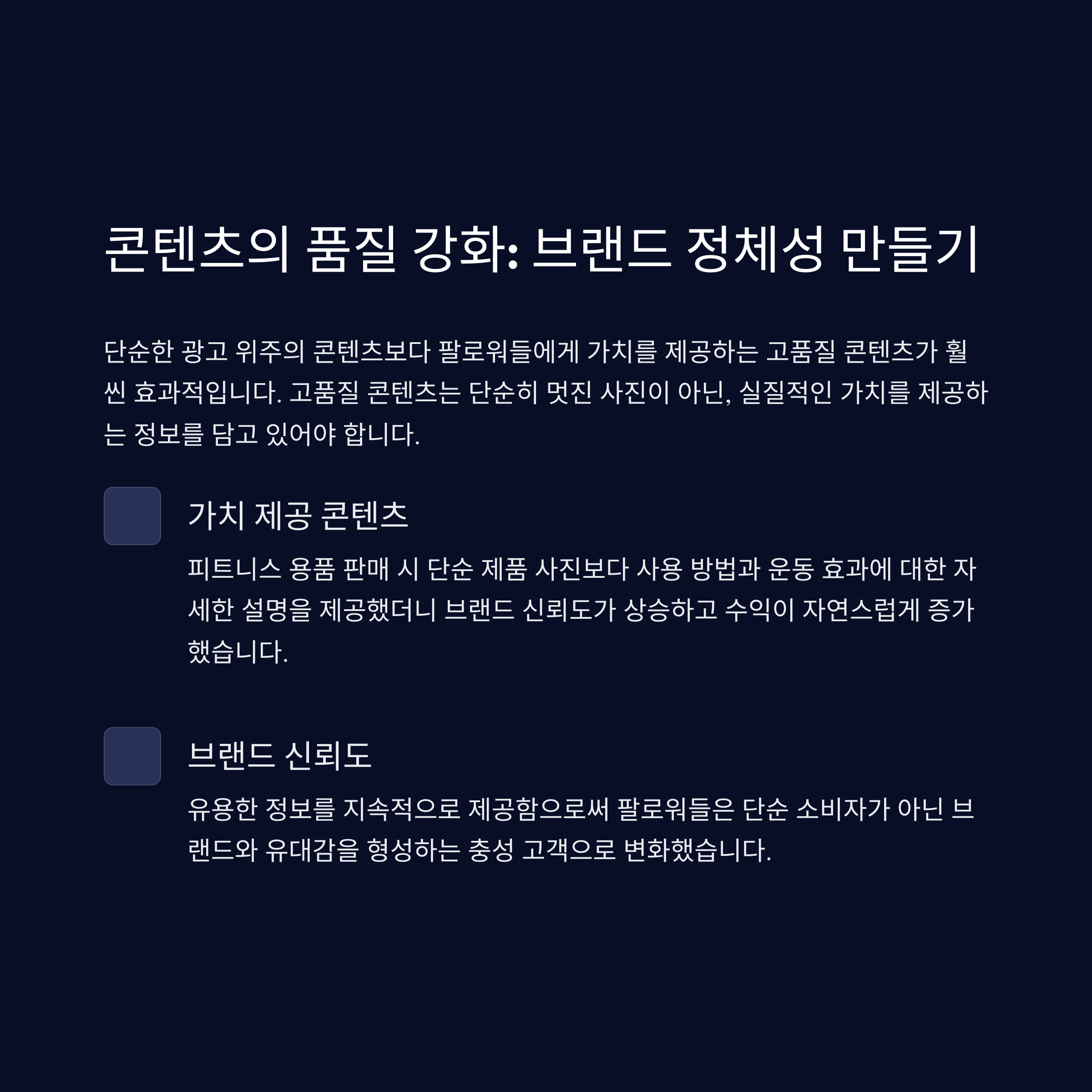 고품질의 콘텐츠란 단순히 멋진 사진이나 영상을 뜻하는 것이 아니라, 팔로워들에게 가치를 제공하는 정보를 제공하는 것입니다. 예를 들어, 제가 판매한 피트니스 용품에 대해 단순한 제품 사진을 올리기보다는, 그 제품을 사용하는 방법이나 운동 효과에 대해 자세히 설명한 콘텐츠를 올렸습니다. 이처럼 정보를 제공하고 사람들에게 유용한 콘텐츠를 올리면, 브랜드에 대한 신뢰도 쌓이고, 수익도 자연스럽게 증가하게 됩니다.