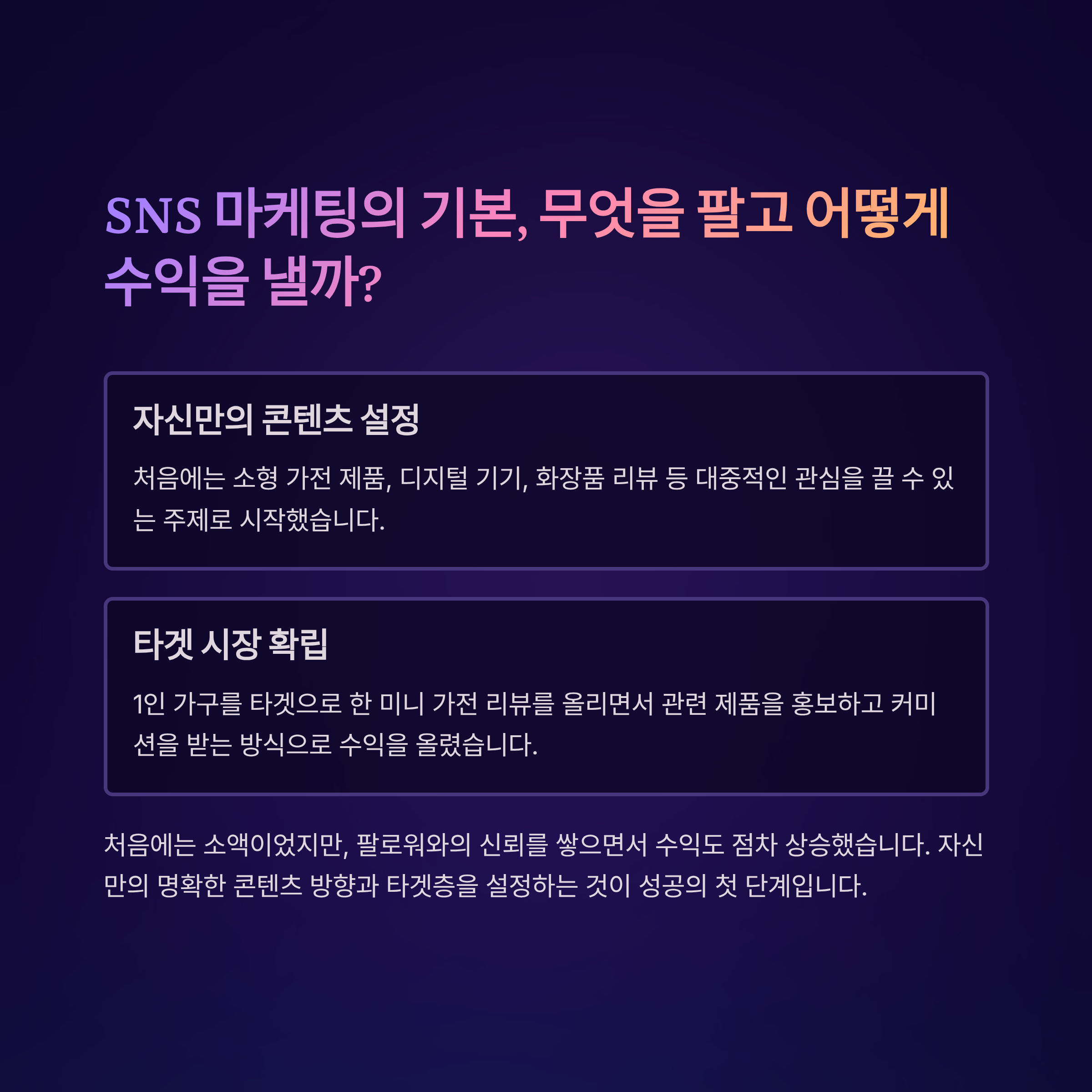 SNS 마케팅에서 수익을 낸다고 하면, 무엇을 팔고 어떻게 판매할 것인지가 가장 중요합니다. 저도 처음에는 어떤 제품을 홍보할지와 타겟 고객층을 어떻게 설정할지 고민이 많았죠. 처음엔 소형 가전 제품이나 디지털 기기, 화장품 리뷰를 주제로 시작했어요. 이유는 대중적인 관심을 끌 수 있기 때문이었죠.